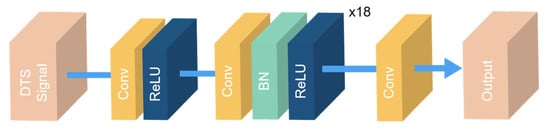 To study the effect of different noise types on neural network performance, we used the same neural network structure to analyze them. The neural network structure employed was the 1DDCNN proposed in [17], which shows much better denoising performance than conventional algorithms. As shown in Figure 5, the neural network is composed of convolution (Conv) layers [21], rectified linear units (ReLU) layers [22], and batch normalization (BN) layers [23]. The neural network consists of 20 Conv layers. The one-dimensional convolution kernel size is 3. The channel number of the first and last Conv layer is 1, and the channel number of the rest of the Conv layers is 64. The ReLU layers turn results less than 0 into 0, and the data greater than 0 remain unchanged, which brings nonlinearities. The BN is employed to normalize the data during training to help the network converge more quickly. The raw RDTS data are first normalized by dividing by its maximum value. Then, the normalized data are input into the neural network, and the denoised data are obtained through a layer-by-layer calculation.