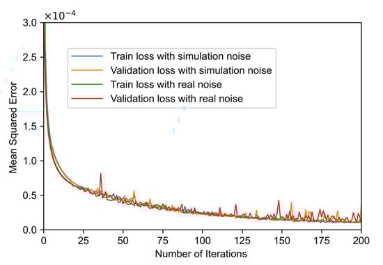 To train the neural network, we generated 10,000 curves for training with each of the two types of noise. Each curve contains 10,000 sample points. Of the data, 80% is used as the training set, and 20% is used as the validation set. As shown in Figure 6, after iteratively training for 200 epochs, the mean squared errors of both neural networks tend to be stable.