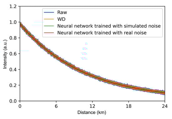 The AS light curves processed by the two neural networks are shown in Figure 7. Both neural networks can effectively reduce the noise of the distributed Raman scattering signal. As a comparison, we also show the result using WD, which is a conventional method for processing RDTS signals [14]. We used the db3 wavelet function to decompose the RDTS signal in three layers and the soft threshold method to process wavelet coefficients of each layer. Then, the processed wavelet coefficients and wavelet function are used to reconstruct the signal. The noise is reduced by 1.3 dB using the WD. Further, a noise reduction of 3.2 dB is achieved using the neural network based on simulated noise. The neural network based on actual noise can reduce noise by 4.1 dB.
