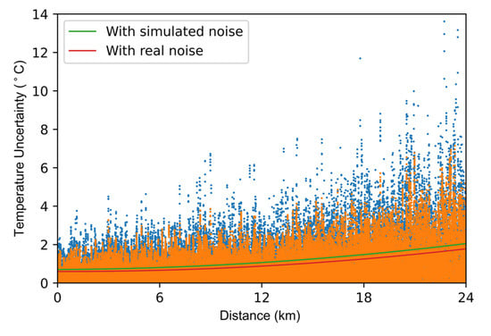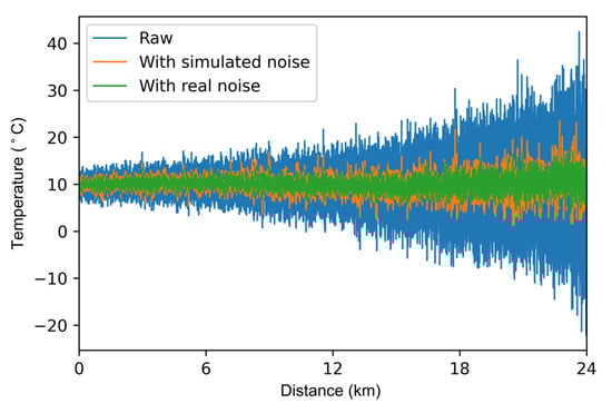 The temperature uncertainty results are shown in Figure 9. After processed by the neural network with simulated noise, the temperature uncertainty is improved to 2.05 °C. Furthermore, the temperature uncertainty is 1.77 °C when using the neural network trained with real noise. The neural network trained with real noise can provide a better noise removal effect. Therefore, we process the RDTS data using the neural network trained with real noise in the following experiments.