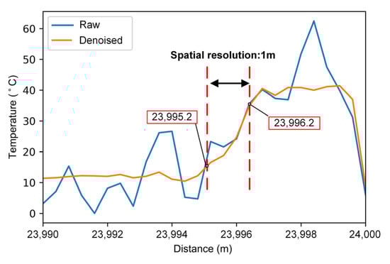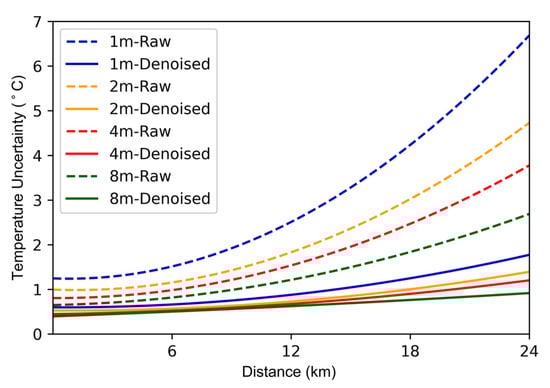 To illustrate the effectiveness of the denoising neural network on RDTS with different parameters, we set the pulse width of the laser to 10 ns, 20 ns, 40 ns, and 80 ns, corresponding to the spatial resolutions of 1 m, 2 m, 4 m, and 8 m. The temperature uncertainty curve is shown in Figure 11. The temperature uncertainty after denoising is significantly better than the unprocessed one. As the spatial resolution increases, the temperature accuracy is further optimized. When the spatial resolution is 8 m, the maximum temperature uncertainty after denoising can reach 0.91 °C.