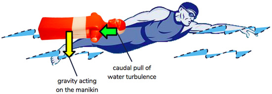 There are various styles of manikin-carrying. In this study, we limited the subjects to performing the “back-of-neck carry” style, in which the swimmer uses a firm backhand grip at the back of the manikin’s neck to safeguard the victim in a secured position [7], to reduce variations. To stabilize a 60-kg, fully-filled manikin close to the body, shoulder muscles have to work against two forces (Figure 1), namely (1) gravity acting on the manikin, and (2) caudal pull from water turbulence against forward propulsion. Sustained internal shoulder rotation, along with the extension and adduction of the manikin-carrying arm, were commonly found in all athletes, regardless of the carrying angle of their shoulder and elbow. Internal rotation of the arm assisted in holding the back of the neck of the manikin; shoulder extension served to work against gravity while shoulder adduction maintained the manikin close to the athlete’s body.