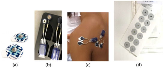 Electrode attachment: (a) wireless EMG electrodes; (b) rubber gaskets; (c) clips with pre-gelled surfaces; (d) double-sided tape.
