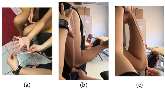 The anthropometric characteristics were measured. The lengths of the first web space and the upper and forearm (i.e., lever arm from the point of muscle exertion to the point of loading force) were recorded by the same tester using measuring tape. First web space was measured in full thumb abduction (Figure 3a). Upper arm length was measured from the greater tuberosity of the humerus to the ulnar styloid with the elbow fully extended (Figure 3b), while forearm length was measured from the olecranon process of the ulna to the radial styloid (Figure 3c).