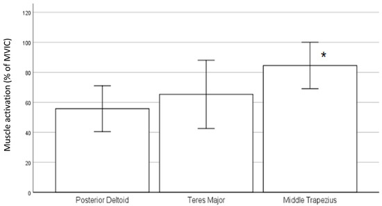 The sEMG results suggested that the athletes showed meaningful activation in the middle trapezius (MT), teres major (TM), posterior deltoid (PD), and latissimus dorsi (LD), in descending order (Table 3).