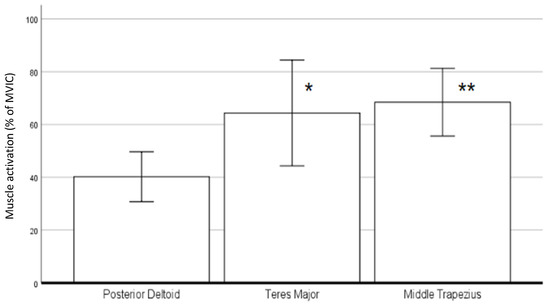 Muscle activity in middle phase (in % of MVIC). * Significantly higher muscle activation than posterior deltoid (p = 0.04). ** Significantly higher muscle activation than posterior deltoid (p < 0.01).