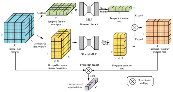 The key of SAP-SGFSAP and ASP-SGFSAP is to generate a temporal-frequency attention map for frame-level features. Given a temporal attention map generated by SAP or ASP (detailed in Section 2.1) and a frequency attention map generated by SGFSAP, this paper first expands the two attention maps to because of the different shapes of them. As described in Section 3.1, , and () is expanded into an matrix using the same padding along the temporal axis. Here, R is the number of frames in each group. Thus, a frequency attention map with a size of can be obtained. Then, is expanded into an matrix using the same padding along the entire frequency axis. Finally, the expanded attention maps are combined with element-wise multiplication to generate the final temporal-frequency attention map , which is channel-independent and group-varying.