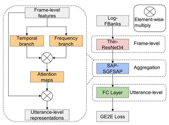 In this subsection, two attention-based temporal-frequency aggregation methods are developed: SAP-SGFSAP and ASP-SGFSAP. Specifically, SGFSAP is used to build the frequency branch, and SAP or ASP is used to build the temporal branch, as shown in Figure 1 and Figure 2. Attributed to their parallel structure, the two temporal-frequency aggregation methods can simultaneously capture the speaker-dependent information contained in the time domain and frequency domain, thus obtaining more discriminative utterance-level representations than temporal aggregations. Note that SGFSAP can be used alone and achieves better performance than all temporal aggregation methods, which will be shown in the following.