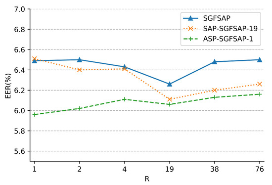 In this subsection, the CNN-based systems using SGFSAP, SAP-SGFSAP, and ASP-SGFSAP with different values of R (i.e., , ) are compared to validate the effectiveness of the grouping method. When , SGFSAP, SAP-SGFSAP, and ASP-SGFSAP become the aggregation methods without grouping. Figure 4 shows the variation of EER with R of different SV systems. From Figure 4, the following observations can be made:
