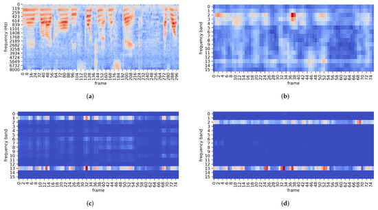 - Most of the phonetic discriminative information is concentrated in the region from 0.5 kHz to 3.5 kHz [28], which contributes little to speaker verification. Figure 5c,d indicate that the frequency bands in this region are assigned very low attention scores (i.e., the blue region from frequency bands 3 to 11 in Figure 5c,d) to suppress irrelevant information.