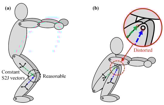 However, human body segments are not rigid bodies, as they are easily affected by the deformation and sliding of the skin over the underlying bone as well as muscular contractions. In addition, human body segments are connected by soft elements, such as muscles, tendons, and cartilage, unlike a mechanical joint. As such, the position of the joint center relative to the body segment is not fixed. These body deformations are known as soft tissue artifacts (STAs). In the case of performing a squat, for example, predetermined constant S2J vectors can be applied reasonably when the knee is slightly bent as shown in Figure 1a, but they will be distorted from the truth S2J vectors when the knee is fully bent as shown in Figure 1b. Therefore, the use of the constant S2J vectors is one of the most critical factors for the inaccurate estimation of relative position.