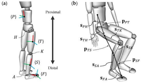 Lower body segments are connected sequentially through joints and can be categorized into proximal (p) and distal (d) segments based on a specific joint J (i.e., H, K, and A). For the hip joint as an example, p and d correspond to {P} and {T}, respectively (see Figure 1). When a joint connecting two adjacent segments is modeled as a spherical joint, the relative position from p to d is determined as follows: