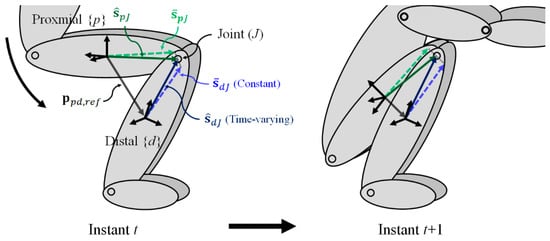 While the constant S2J vector determined via optimization techniques does not reflect deformation caused by STAs, it can still provide the approximate position information of a joint for a certain segment. In this regard, constant vectors are used as measurements in the KF. In the proximal region, constant S2J vector is modeled as , where indicates that the S2J vector is constant, and is the deformation of the S2J vector. In addition, because the S2J vector must satisfy Equation (2) when the truth references of relative orientation and position measured via motion capture are applied, the following measurement equation is obtained: