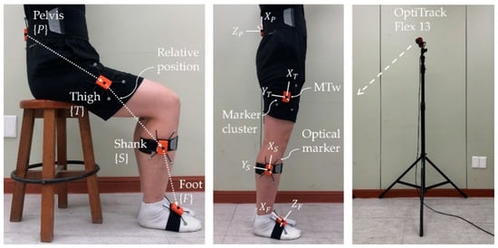 To validate the proposed method, we used an MTw IMMU (Xsens Technologies B.V., Enschede, The Netherlands), which included a gyroscope, an accelerometer, and a magnetometer. Each IMMU was attached to the back of the pelvis, to the sides of the thigh and shank, and to the foot using a Velcro band, in the same direction as the coordinate system shown in Figure 1: Red corresponds to the x-axis, green to the y-axis, and blue to the z-axis. The truth references of the orientation and position for the learning and performance verification of the proposed method were provided by the OptiTrack Flex 13 camera motion capture system (NaturalPoint, Inc., Corvallis, OR, USA). The sampling rate for both systems was set to 100 Hz. In addition, the IMMU was fixed to a marker cluster plate with three reflective markers forming a plane, which enabled to calculate the truth reference orientation, as shown in Figure 4.