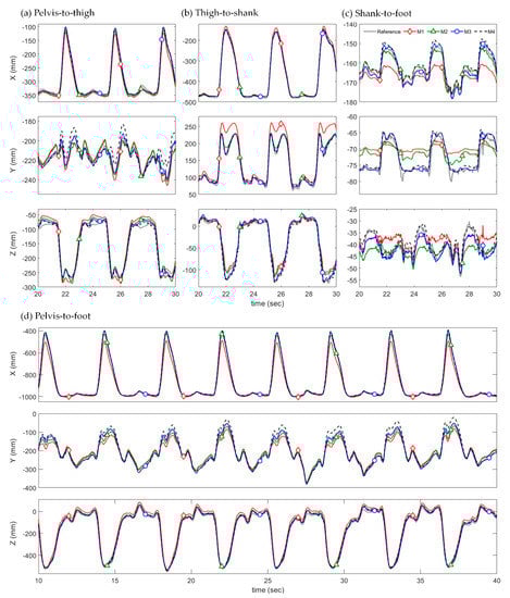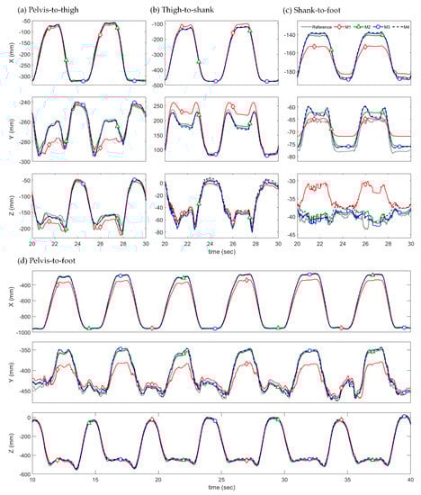 Table 2 lists the averaged RMSEs of the relative position estimated using the four different methods. Table 3 lists the averaged RMSEs of the estimated 3D joint angles applied to M4. Figure 6 and Figure 7 show the 3D relative position estimation results for pelvis–to–thigh, thigh–to–shank, shank–to–foot, and pelvis–to–foot of Tests 1 and 3 from Subject 1.