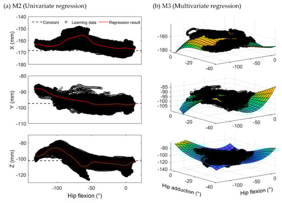 Regression results of S2J vectors for pelvis–to–hip from (a) M2 and (b) M3.