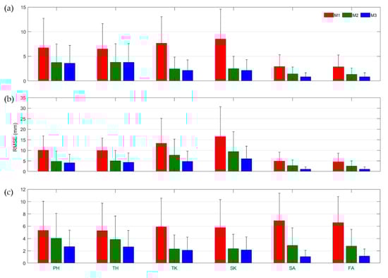 Averaged RMSE and the standard deviation of S2J vectors for learning data from (a–c) Subject 1–3: PH (pelvis–to–hip), TH (thigh–to–hip), TK (thigh–to–knee), SK (shank–to–knee), SA (shank–to–ankle), and FA (foot–to–ankle).