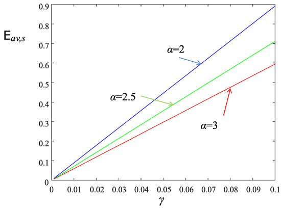 The average harvested energy per slot, , is plotted vs. in Figure 4 for three values of the path loss exponent . As it is expected, as increases the amount of energy harvested by a sensor node at each time slot is reduced. The differences are magnified for larger values of the parameter .
