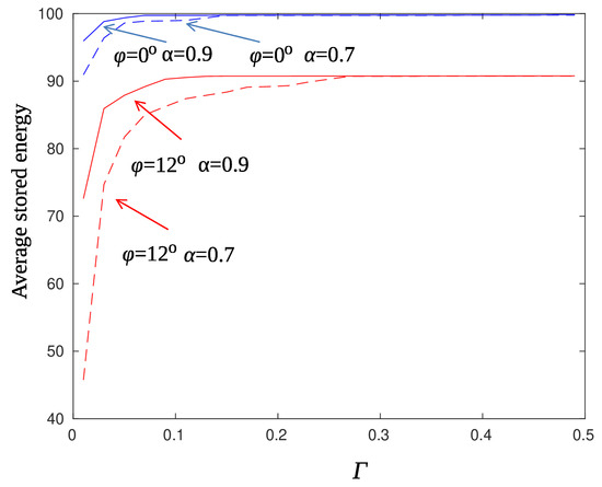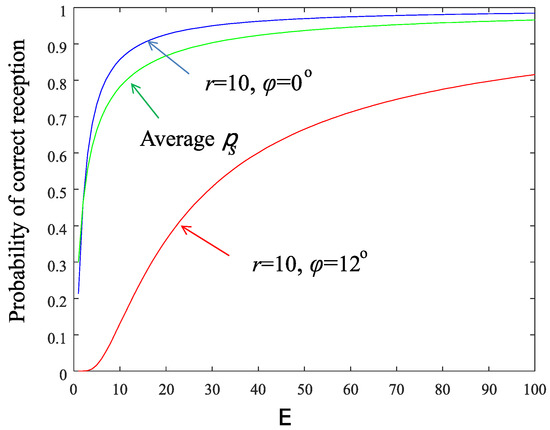 Figure 5 depicts the probability of successful reception of messages vs. the available energy level for two nodes located at the edge of the network (). The first node is located at the axial direction of the beam (blue color) whereas the second node is located at the boundary of the sector (red color). The values of the parameters used are given in Table 1. Moreover, in Figure 5 the average probability of successful reception (Equation (16)) is plotted with green solid line.