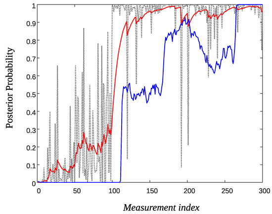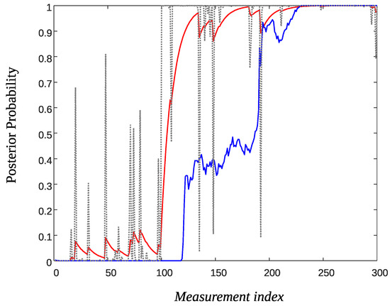 Figure 8 shows a trace of the posterior probability (Equation (25), dotted black line) generated using , and . The time of the event was taken at . As it is observed there are large false spikes both prior to the event and after. The red solid line depicts for . Although there is some sort of smoothing there are substantial high values of the posterior probability prior to the event which may lead to several false detections. Decreasing improves smoothing but the slope of the curve after the event decreases. This means that an extra delay may be introduced before detecting the event.