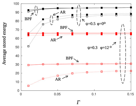 Average stored energy for particle filter (solid line) and AR filter (dotted line), with parameters , , m, , (black lines), and , (red lines). Filled squares mark both threshold and energy criteria (Cr. 35), squares mark only threshold criteria (Cr. 36).