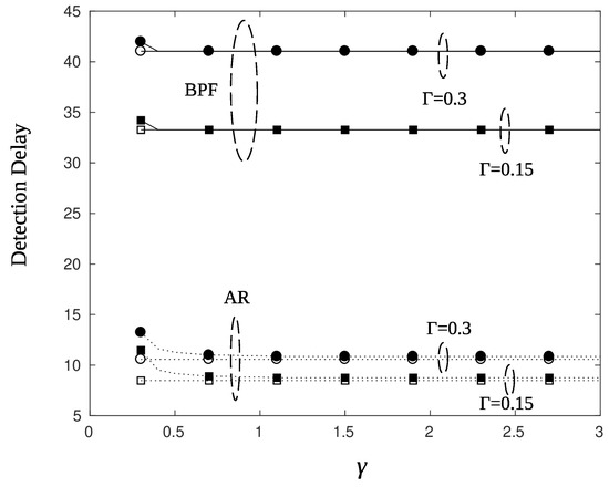 Detection delay for particle filter (solid line) and AR filter (dotted line), with parameters , , , m, (square), and (circle). Filled squares mark both threshold and energy criteria (Cr. 35), squares mark only threshold criteria (Cr. 36).