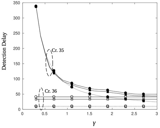 Detection delay—average number of false alarms before the event, with parameters , , , m, , and .