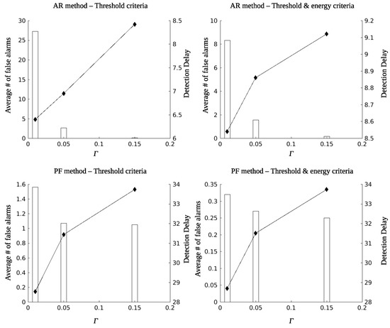 Figure 16 summarizes some comparative results for the case of a sensor that charges well (). The left column of figures corresponds to criterion 36 whereas the right column corresponds to criterion 35. The first row of figures is for AR filtering () and the second row is for Beta Particle Filter smoothing. The average number of false alarms is depicted with bars, whereas the detection delay is depicted with filled diamond marks. As it is observed, for very small values of the threshold parameter , the Beta Particle Filter smoothing results in considerably smaller values (tenfold reduction) of false alarms compared to AR filtering. However, the situation is reversed regarding the detection delay. Using criterion 35, although the detection delay is not affected, the false alarm rates are reduced by a factor of three (or more) for small values of the parameter .