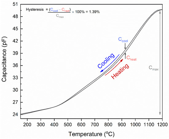 - As stated in Section 3.2, the relaxation of the quasi-free charges during the cooling cycle is slower than the heating cycle due to the volumetric heat capacity of Al2O3. Therefore, it loses thermal energy slower than gaining the same amount of thermal energy [44]. Hence, during the cooling cycle, the dielectric permittivity of Al2O3 relaxation is slower than the heating cycle. It was translated to the fr as temperature lag during cooling.