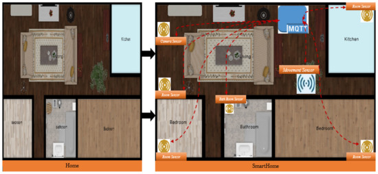 A smart home was created from a non-smart home (see Figure 2). An unintelligent house might be regarded as a house that has to be reconfigured before becoming intelligent. Figure 2 depicts a large number of interconnected sensors that communicate with one another over the MQTT protocol in order to help visualize this.