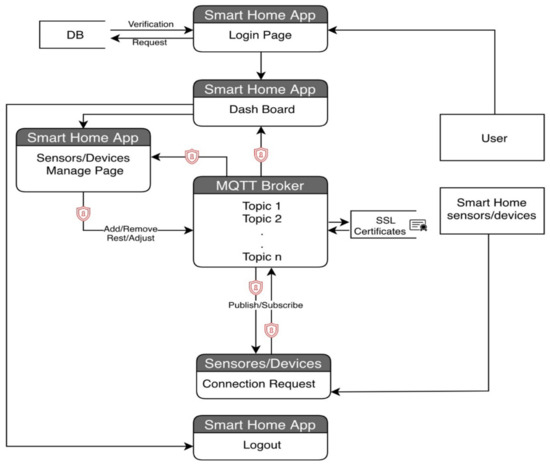 Based on the proposed concept, the functional specification for a smart home MQTT model is presented in Figure 3. The primary requirement for a smart home system is to provide the appropriate level of security for the identification of the user who will log into the Smart Home System in order to view the status of embedded devices, as well as the capability to manage the machine-to-machine identification that connects to the MQTT broker for subscribing and/or publishing messages. Putting information out there requires an embedded device communicates with a MQTT broker, and the data exchanged between the two is encrypted. The interactions occur between an MQTT broker and a smart home system.