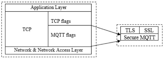 Developing a conceptual architecture for the procedures necessary to tackle the MQTT security problem is the central point of the proposed algorithm development strategy. The suggested improved MQTT secure transmission flags for usage in smart homes are based on two TCP Header Flags: TCP Explicit Congestion Notification (ECN-Echo) and Congestion Window Reduced (CWR) associated duties. That is, it was designed to be utilized in a similar manner to how TCP utilizes various flags to control flow. This is because TCP does not provide security flags, while MQTT utilizes TCP transmission sessions. As a result, this study takes the approach of including security flags in MQTT transmission. As seen in Figure 5, the proposed notion is sandwiched within TCP flags from which an encryption flag for data in a MQTT transmission session would be generated. Additionally, this flag will be associated with the embedded Transport Layer Security (TLS) protocol, Secure Sockets Layer (SSL), a security mechanism for authenticating users and preventing unauthorized user access to MQTT.