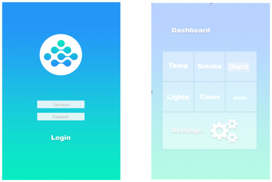 A mobile interactive interface with the smart house MQTT model was created after the setting had been constructed (Figure 6). Icons and buttons, among other things, are used to allow the user to interact with a product or device while engaged with the system. UI refers to the frontend page that is displayed to the app user when the app is opened and allows the app user to interact with the backend of the app. A smart home app displays four screens for users during the design interaction; these screens are as follows: a login page for the user, a dashboard screen for the user to monitor system status, a screen on which the user can adjust, reset, or delete a device/sensor, and finally a screen on which the user can add a new device/sensor with its associated room name.