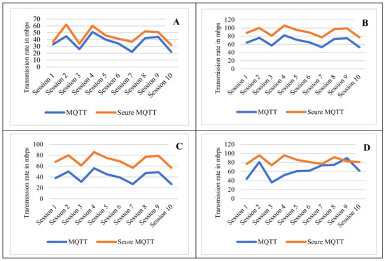 The verification rate within various transmission sessions performed during the experiment are presented (see Figure 7). Many transmission scenarios were recorded in order to assess the importance of verifying the integrity of messages and to compare the effectiveness of different transmission methods. Within the four scenarios presented (see Figure 7A–D), they indicate the transmission within the connection for each session. Figure 7A shows secure MQTT transmission at a rate of 40 to 60 mbps, and the transmission session data associated with the header flags is presented in Table 1. The difference between Figure 7B–D is that in all cases, the details transmission flag is detected within a reasonable range of data rate. The publisher and subscribers send information to the broker via the internet. The design is such that both the publisher and the subscriber could be from untrusted MQTT clients, which could be potentially harmful. The checking is done in relation to the data integrity checks that allow the transmission to ensure that third parties did not modify any content of the MQTT message runs by subscribing and receiving a message from published command in port 8884, then the communication between server and client is secured and the data is encrypted. When comparing transmission over secure MQTT to transmission over conventional MQTT, an important result was obtained (see Figure 7; y-axis is the transmission rate in mbps).
