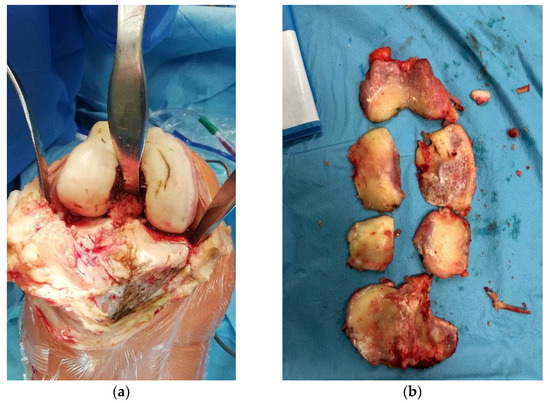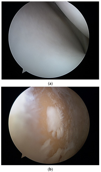 All surgeries were performed by a specialized surgeon in TKA or arthroscopy according to a standard protocol depending on the type of surgery. A standard 30-degree scope was used for cartilage evaluation in arthroscopic procedures, with instruments introduced through standard anteromedial and anterolateral portals. All TKAs were performed through an anteromedial approach to the knee joint and visual evaluation of articular surfaces in cases of TKA after articular surface resection. The International Cartilage Repair Society (ICRS) grading score [49,50] was used for cartilage evaluation. Arthroscopic visualization of healthy cartilage and grade IV lesions are shown in Figure 1a,b. The intraoperative view during TKA prior and after resection of articular surfaces is shown in Figure 2a,b.