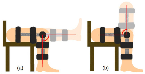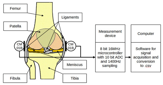 The vibration data were acquired using a dedicated measuring system. The system consisted of three main subsystems—an orthesis, a measuring device and a computer. A dedicated orthesis with vibration transducers and a rotary encoder was placed on the patient’s knee. CM01B solid body microphones with a bandwidth from 10 Hz to 2 kHz were used [51]. The encoder used was a 10-bit Bourns [52] digital magnetic continuous encoder with 10 bit precision, giving it 1024 values per 360 degrees of rotation. The range was limited by hard stops between 0 and 90 degrees. Rotation data were sampled about ten times per second. The sensory setup was placed on a knee according to Figure 1 and connected to a dedicated measurement device consisting of several subsystems, as presented in Figure 2. First, the signal was conditioned using a preamplifier. Afterwards, the analogue signal was sampled using an 8-bit microcontroller Atmega2560 with a 10 bit ADC and a serial/usb interface. Additionally, it was necessary to provide galvanic isolation to ensure patient safety. The device uses an ADuM4160 USB 2.0 isolator chip [53] and an 11.1 V 3 s Li-Ion battery with a step-down converter and battery management system. The stream of data from the device was recorded by a computer and saved as a comma-separated value file. Measurements were taken during joint movement in an open and closed kinematic chain, as presented in Figure 3. A schematic showing the main modules of the measurement system is shown in Figure 4 while the leg motion in the open and closed kinematic chain is shown in Figure 5.