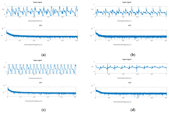 A large number of signal features (parameters) called state indices are used in vibroacoustic diagnostics [65,66,67,68]. A summary of the parameters determined for the discrete signals used in this paper is presented below. These measures were selected based on literature data and previous studies of the authors selection of optimal signal features [28,29].