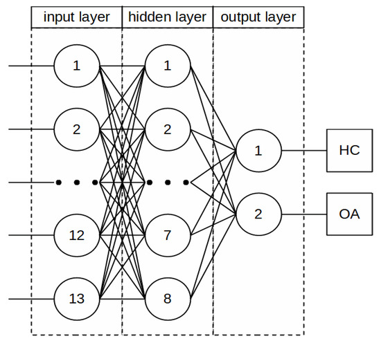 Three classification variants were considered in the study to determine the optimal testing protocols allowing the best possible diagnoses of cartilage damage. The Statistica 13.1 package (Tulsa, OK, USA) containing modules including machine learning and artificial neural networks was used for the calculations. In all variants, information such as age, gender, BMI (Body Mass Index), and selected measures of acoustic signals were provided at the inputs. Data are randomly divided into 70% training, 15% testing, and 15% validation. A 2-stage simplified classification corresponding to cartilage damage states was proposed at the outputs: 1-healthy cartilage, 2- cartilage for further diagnosis and surgical treatment (I to IV degree of damage according to the Kellgren–Lawrence scale). Variant I involved teaching the network using selected measures of signals recorded in a closed kinetic chain (CKC). Variant II involved selected measures of signals recorded in the open kinetic chain (OKC). Variant III included selected signal measures for both kinetic chains (CKC and OKC). A graphical visualization of the neural network used is shown in Figure 7.