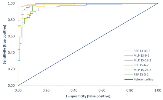 A neural network is a collection of properly connected neurons arranged in layers. An artificial neuron from a technical point of view is an element whose properties correspond to the selected properties of its biological counterpart [73]. The input signals are multiplied by coefficients called synaptic weights. Each neuron calculates a weighted sum of its inputs, and these are then summed up. The activation level thus determined becomes the argument of the transition function (activation function), which calculates the output of the neuron [74]. The input signals are multiplied by factors called synaptic weights. The values of the weights can be changed; this allows the network to learn and adapt to the considered task. The activation level thus determined becomes the argument of the transition function (activation function), which calculates the output value of the neuron [74,75]. The most common type of networks are the MLP (Multilayer Perceptron) [76,77] and RBF (Radial Basis Function) neural networks. The number of input and output neurons depends on the complexity of the problem being solved. One of the most popular applications of neural networks is solving classification problems, in which ANN is a tool for assigning the studied objects to the correct classes [78,79].