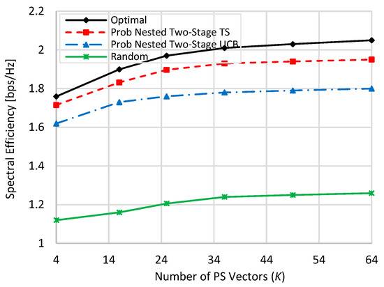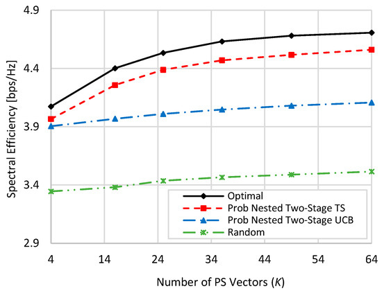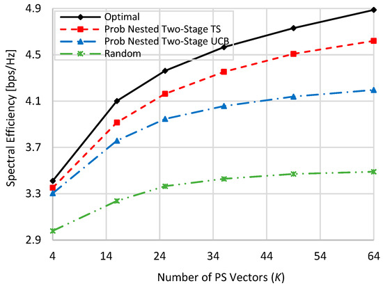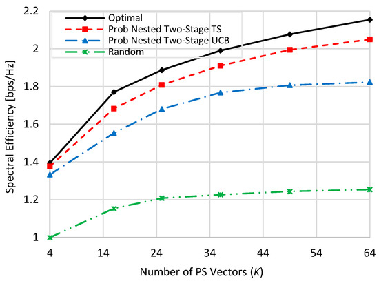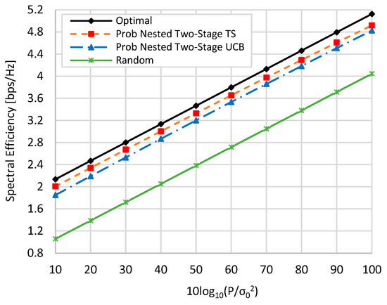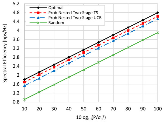 at zero blockage, when K = M = N = 16, and when N = 36, M = 64, and K = 16. Generally, as the value of is increased, the spectral efficiency of all schemes is linearly increased. In addition, the spectral efficiencies in the case of N = 36 and M = 64 are slightly higher than those in the case when N = 16 and M = 16 due to the increase in beamforming gain resulting from increasing the number of antenna elements. From Figure 6 and Figure 7 and at TX SNR = 10 dB, about 93.8% (94%), 84.9% (86.9), and 51% (49.7%) of the optimal performance are obtained by the proposed nested two-stage TS, UCB, and random selection, respectively. These values become 96.5% (96%), 94.2% (94.16%), and 81.4% (78.8%) at SNR = 100 dB, respectively.