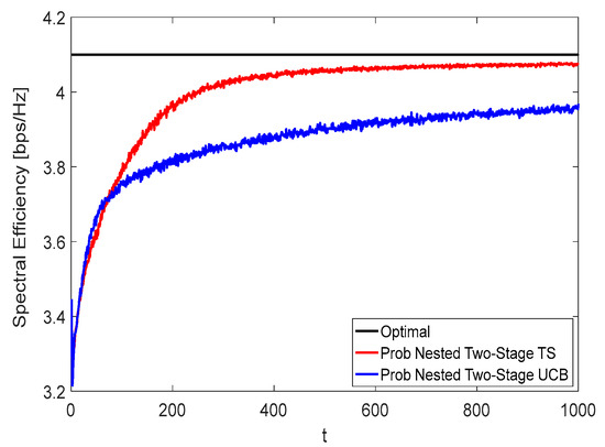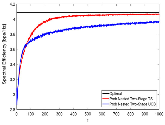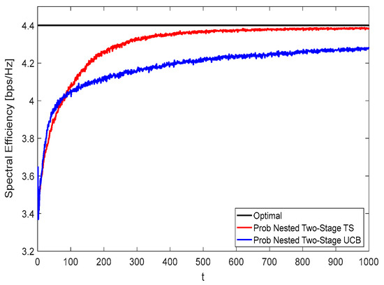 Figure 8 and Figure 9 show the spectral efficiency convergence rate of the proposed nested two-stage MAB schemes against the time horizon using K = N = M = 16 at zero and moderate blockage effect with blockage probability of 50%, respectively. Due to the effect of blockage, the spectral efficiency performance given in Figure 9 is lower than that represented in Figure 8. From these figures, it can be seen that the proposed nested two-stage TS has a faster convergence rate than the UCB-based one due to its Bayesian strategy. Interestingly, the proposed nested two-stage UCB has better convergence than the TS-based one at low values of , where the TS algorithm starts to build up the prior/posterior distributions of the achievable reward. As these distributions are constructed, the TS converges faster than UCB, as shown by these figures. At