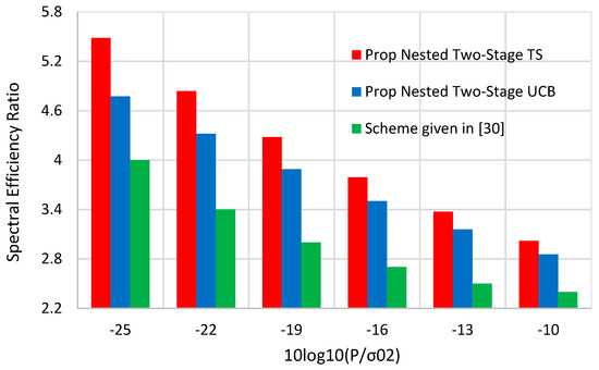 Spectral efficiency comparisons between the proposed nested two-stage MAB schemes and the scheme proposed in [30].