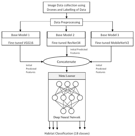 We investigated an approach for farmland habitat classification which is an important contribution to improved monitoring and preservation of ecosystems. High-resolution self-collected drone images were used collected over 18 different habitat types that were grouped into six broad categories. A stacked ensemble model was proposed which reduced the bias and variance and thus improved the prediction accuracy. The average accuracy over all the classes reported was 88.31% using this approach. Although an effective farmland habitat classification technique is proposed, there is room for further work. The data set used in this work is an imbalanced one with only 2233 samples across a comparatively large number of classes. More samples need to be collected that should be balanced across all possible habitat types to improve the accuracy of the deep learning technique. As an extension of this work, we aim to collect more samples and label them to make the dataset publicly available so that the entire research community can benefit. Other state-of-the-art pre-trained CNN architectures could be tried and various combinations of pre-trained CNNs could be explored in the future to understand the best possible model that will adapt the minute variations of the features among different habitats. In this work, tuning was conducted only for identifying the best optimizer and learning rate. Extensive hyper-parameter tuning could be conducted to develop the best fit model for particular applications. Different mechanisms to develop resource-efficient, deep learning models for mobile edge devices and other IoT devices used in smart agriculture have to be investigated. Based on the requirements of the execution environment (e.g., mobile phone or UAV capturing farmland images), a suitable compressed deep learning model can be generated.