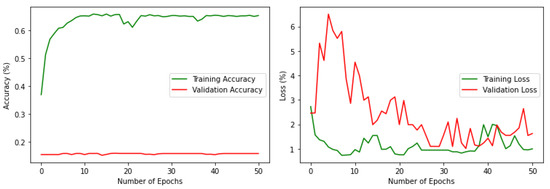 Some datasets contain class imbalance and have far more instances than others (Figure 3). Achieving high classification accuracy with this data was difficult. However, to assess the performance with this imbalanced data, a simple classification was performed with a VGG16 pre-trained model by changing the number of nodes in the final classification layer to 18. 20% of the data has been used for validation. The results are shown in Figure 4. It can be noted that the performance is poor in terms of both accuracy and loss. The validation accuracy is less than 20%, which clearly outlines that if the imbalance in the actual data stream is reflected, it can lead to poor average precision during deep learning classification. Therefore, it was necessary to balance the dataset with nearly equal data over different classes. The high-resolution drone images have a spatial resolution of 4000 × 3000 pixels. The images were resized and scaled using bilinear interpolation [55] to make them compatible with the input size of the base models; in this work, it was set as 150 × 150. Using bilinear interpolation, the size of the images was reduced without affecting the characteristics of the actual high-resolution images and thus the features are preserved for the deep neural network classification. Then the images were boosted and augmented using 4 different transformations: rotation, flipping, shifting, and shear. The transformations were applied iteratively for different classes by changing the parameters (rotation range, flip direction, shift range and direction, shear range) of each transformation.