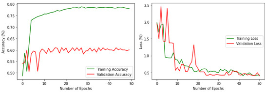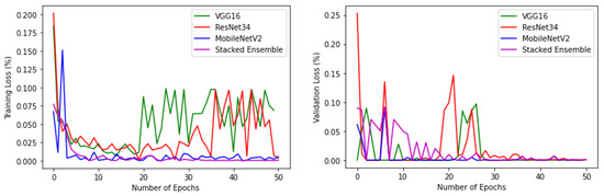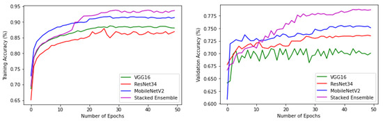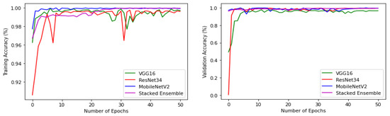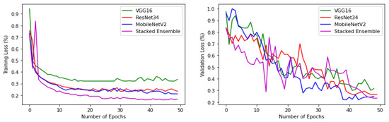 The experiments were conducted using a core i7, GTX 1650 Graphics Processing Unit (GPU) with 16 GB RAM. The weights of each model were saved when it achieved maximum validation accuracy, preventing it from overfitting. The variation of accuracy and loss with respect to the number of epochs for training and validation are shown in Figure 9 and Figure 10. For all models, the training step was carried out to 50 epochs. It can be seen from the results that the highest accuracy and lowest loss for both training and validation were obtained for the stacked ensemble model. The accuracy was improved considerably for the meta-learner.