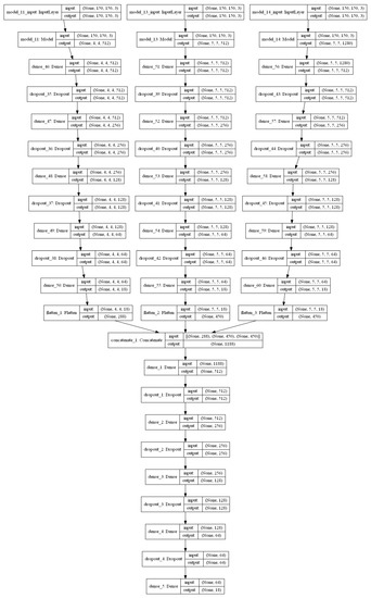 Since the dimensions of the input images are scaled to 150 × 150 during the pre-processing step, the base models are also modified to make them compatible with the input size. Based on the architecture, the 3 base models with VGG16, ResNet34 and MobileNetV2 produced feature vectors of 4 × 4 × 18, 5 × 5 × 18, and 5 × 5 × 18, respectively, for every image. This is given as input to the final classification layer. The architecture of each model can be understood from Figure 7.