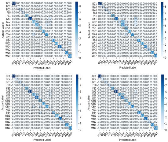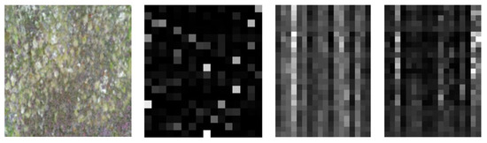 The pre-processed data was split into training, validation, and test data with a ratio of 7:2:1 to ensure different datasets as input to different levels. While training the base-learners, the hidden layers were not flattened as the input is a 2D image, which has significant importance for its spatial coordinates corresponding to brightness, edges, and corners. The predicted features for a sample image are shown in Figure 8. The feature vectors of size 4 × 4 × 18 and 5 × 5 × 18 respectively (refer to the previous Section 2.3) are reshaped to 2D vectors of size (16,18) and (25,18), respectively, for visualization. The base models are trained with training data and the model is saved.