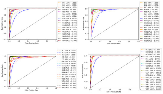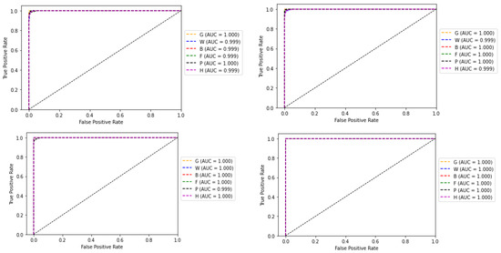 The receiver operating characteristic (ROC) curve, which is a plot between false positive rate (FPR) and true positive rate (TPR) corresponding to the four classifiers, is shown in Figure 12. The area under the ROC curve (AUC) for each class is also shown along with the plots. AUC measures the entire two-dimensional area underneath the ROC curve from (0,0) to (1,1). The value ranges from 0 to 1, representing the probability that the model ranks a random positive sample more highly than a random negative sample.