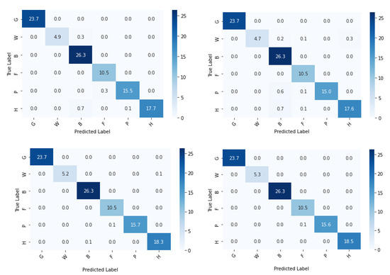 A lot of misclassifications can be seen in the middle blocks of the confusion matrix. The reason is that the middle row constitutes G: grassland and marsh, comprising six subclasses, which is the most in this experiment, all of which have nearly indistinguishable features. In this category, GSi1 had the highest prediction accuracy as it is dry calcareous and neutral grassland with rocky features, not seen in any other habitat types. Misclassifications can be seen in the bottom blocks of the confusion matrix also which constitutes W: woodland and scrub, which has the second-highest number of sub-classes—five, in which WD1 and WN2 have similar features contributing to prediction errors. Though the habitat mapping problem is a challenging task, from Table 6, it can be understood that the proposed method performed well.
