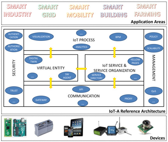 The IoT-A project [25], funded by European FP7-ICT, was aimed at creating an architectural reference model for interoperable and scalable IoT ecosystems as well as at outlining key building blocks, development principles, and guidelines for the technical design of their protocols, interfaces, and algorithms. One of the main advantages of the IoT-A architectural model is the creation of a single global ecosystem of things that communicate seamlessly with each other to support the advanced digital services necessary for the digital transformation of industrial and business processes.